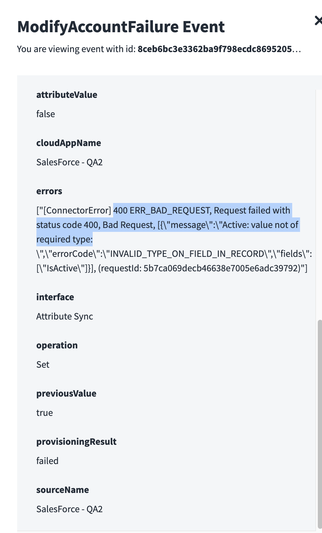 Before changing the identity attribute to a “boolean”, I additionally tried changing the casing to be either “true” or “True”, but nothing I have tried yet has gotten me around this error message from the connector on the provisioning attempt: