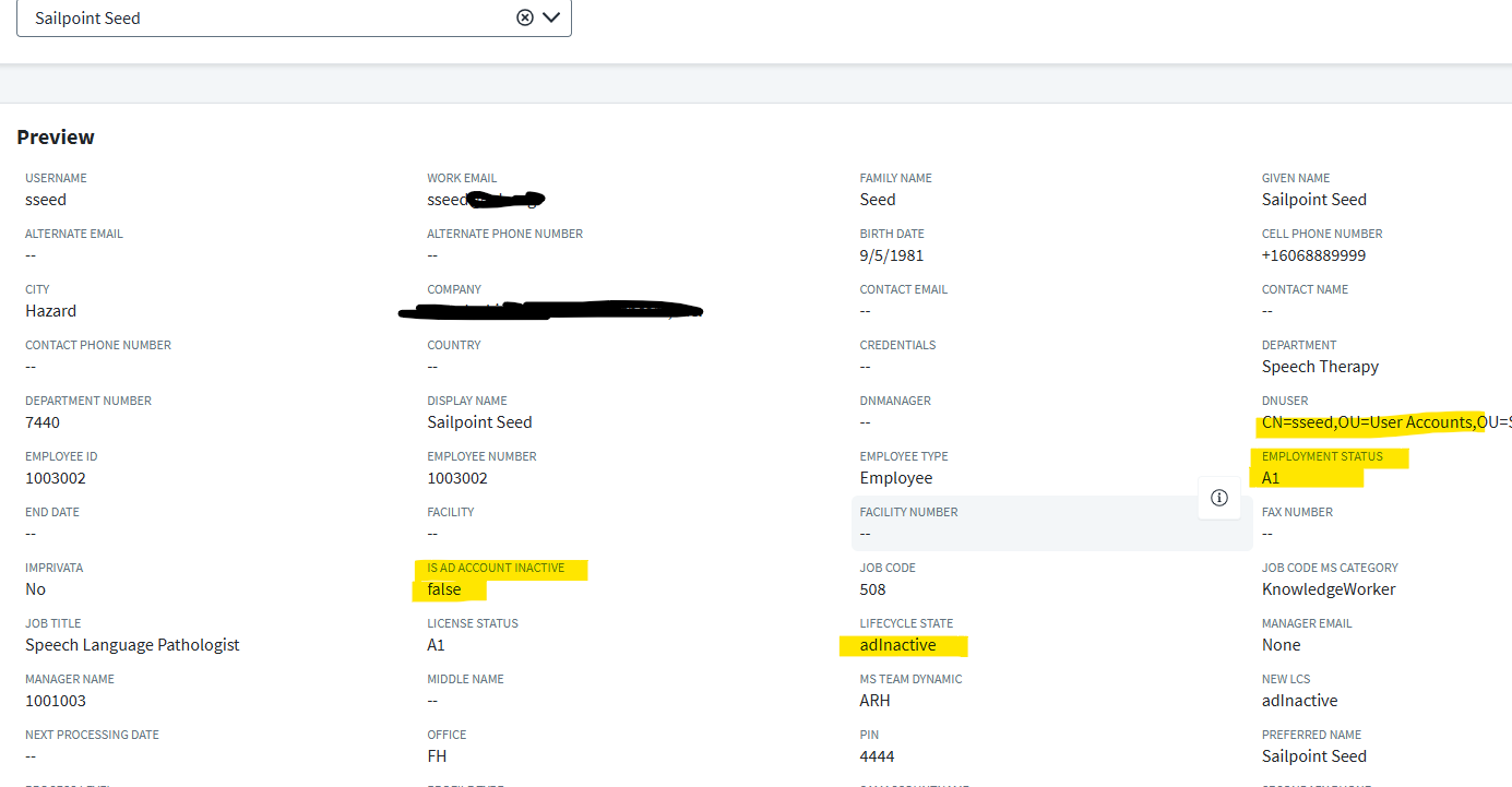 When we went live with SailPoint the professional services setup a lifecycle state called ADInactive. A user gets that lifecycle state if their account is disabled and in an inactive OU in Active directory. Then when a termination comes across from our Lawson system, it is not changing the lifecycle state to inactive. There is a transform which is below. I have tried modifying so that it would set the standard lifecycle state if employment status is T1 and the AD account inactive is true but it will not work. It will also not move the account to the terminated OU and remove groups from the account. The screenshot below the original is what I am trying