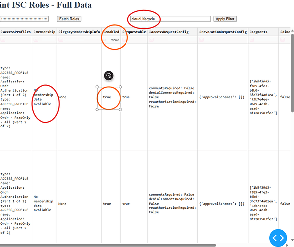 Filtering on columns as well as excluding data from the membership column is shown in this screenshot. The latter is useful if there is a policy that requires the lifecycle state in the membership criteria and you need to validate that all roles are meeting this requirement.